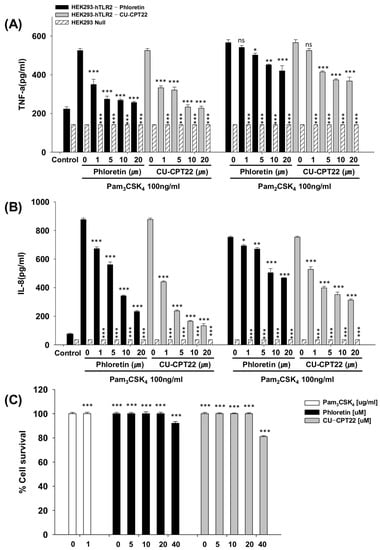 Effect of phloretin on cytokine levels, TNF-α (A) and IL-8 (B), in 100 ng/mL Pam3CSK4- and Pam2CSK4-stimulated HEK293-hTLR2 cells and HEK293-null cells. HEK293 cells were pretreated for 1 h with phloretin (1, 5, 10, 20 µM) or CU-CPT22 (1, 5, 10, 20 µM) before stimulation with the agonists, Pam3CSK4 or Pam2CSK4 (100 ng/mL), for 16 h. Supernatants were collected and the levels of TNF-α and IL-8 in Pam3CSK4- or Pam2CSK4-stimulated HEK293-hTLR2 cells were determined by ELISA. * p < 0.05, ** p < 0.01, and *** p < 0.001 compared to HEK293-hTLR2 cells treated with agonists only. (C) Concentration-dependent toxicity of phloretin, CU-CPT22, and Pam3CSK4 against HEK293-hTLR2 cells. *** p < 0.001 compared to HEK293-hTLR2 cells treated with agonists only. The error bars represent ± SEM. n.s. represents no significance.