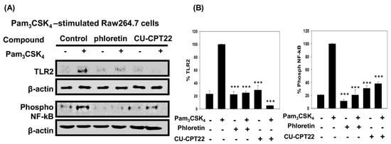 Quantification of protein expression using Western blotting. (A) Indicated protein levels of TLR2 and NF-κB phosphorylation were analyzed in Pam3CSK4-stimulated Raw 246.7 cells with (+) or without (−) phloretin or CU-CPT22. (B) Relative protein expression was quantified using Image J. *** p < 0.001 compared to HEK293-hTLR2 cells treated with Pam3CSK4 only. The error bars represent ± SEM.