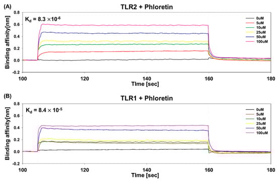 The binding affinity of phloretin to TLR1 or TLR2 was measured using BLI, in which a change in the number of phloretin molecules bound to the TLR1 and TLR2 immobilized on the biosensor tip causes a wavelength shift in the interference pattern of TLRs. Binding of phloretin to TLR1 and TLR2 was monitored following the application of various concentrations (0, 5, 10, 25, 50, 100 μM) of phloretin. Only phloretin binding to or dissociating from the biosensor can shift the interference pattern, corresponding to the rates of association and dissociation. To determine binding parameters, data were analyzed using ForteBio Data Analysis Sofware 7.0.2.8. As shown in Figure 5, the binding affinity of phloretin to TLR2 was 8.3 × 10−6 M (association rate of 4.7 × 104, dissociation rate of 3.9 × 10−1), while that to TLR1 was 8.4 × 10−5 M (association rate of 1.2 × 104, dissociation rate of 1.0 × 10−1), indicating a high-affinity direct interaction. This binding affinity of phloretin to TLR2 and TLR1 determined using BLI indicated that phloretin might suppress TLR2 activation by directly binding to TLR2 and TLR1.