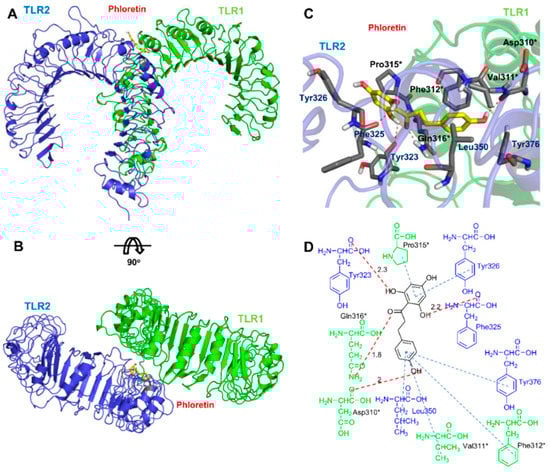 Recently, several inhibitors of TLR2-induced proinflammatory cytokine production have been reported [,,,]. In addition to the well-known inhibitory molecule CU-CPT22 [], virtual screening has been applied to find novel nonpeptide TLR2 antagonists [] and small-molecule TLR2 antagonists with low-micromolar half-maximal inhibitory concentrations []. Flavonoids are secondary plant metabolites that are involved in the defense against environmental stress and pathogenic microbes. Zhong et al. [] discovered an immunomodulatory natural-product-like compound, which was developed as a direct inhibitor of TLR2/1 heterodimerization. Although this compound has a different structure from that of phloretin, they share a similar predicted ligand-binding site at the TLR1 and TLR2 interface.
