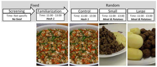 In all studies, the familiarisation and the control meals were identical and took place during typical Swedish lunch hours (11:00 to 13:00). The served food consisted of pre-cooked vegetable hash with chicken bits (referred to as Hash 1; Findus AB, Bjuv, Sweden), using food identical to that served in other studies [1,37]. The familiarisation meals were not analysed, as they served the purpose of introducing the participants to the research protocols. The control meals were used in order to perform group comparisons across different studies, in order to evaluate potential differences among the recruited samples. The control meals were not part of the primary analysis in Studies 1 and 2. In Study 3, the control meal (i.e., Lunch) was part of the planned crossover design, as it was compared with an identical meal served during another day as dinner. For macronutrient composition and energy density of all meals, see Table 2.