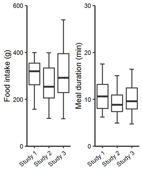 Figure 4 shows the food intake and the meal duration characteristics of the control meal in all the studies. These meals were used for comparison across studies, since the meal serving occasion and the food type was identical.
