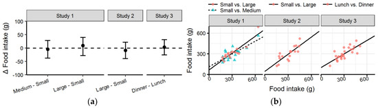 (a) Forest plot with mean difference and confidence intervals of food intake between conditions in each study; (b) Scatter plot with food intake with the Small condition of Studies 1 and 2 and Lunch of Study 3 on the x-axis compared to other condition on the y-axis (see legend).