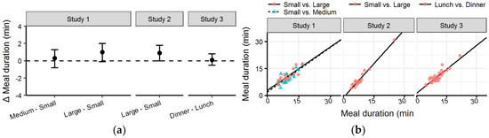 (a) Forest plot with mean difference and confidence intervals of meal duration between conditions in each study; (b) Scatter plot with meal duration with the Small condition of Studies 1 and 2 and Lunch of Study 3 on the x-axis compared to other condition on the y-axis (see legend).