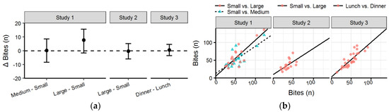 (a) Forest plot with mean difference and confidence intervals of number of bites between conditions in each study; (b) Scatter plot with number of bites with the Small condition of Studies 1 and 2 and Lunch of Study 3 on the x-axis compared to other condition on the y-axis (see legend).