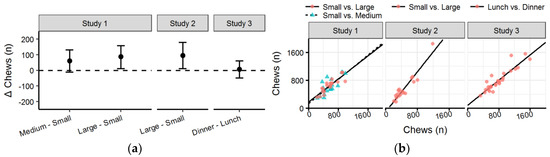 In Study 1 (Table 3 and Figure 8a), there was no significant difference in number of chews between the Small and Medium condition (p = 0.120), but the number of chews was significantly higher in the Large condition (p = 0.018) compared to Small. Similarly, the number of chews in the Large condition of Study 2 was significantly higher than in the Small condition (p = 0.027). In addition, there was no significant difference in number of chews between Lunch and Dinner in Study 3 (p = 0.799).
