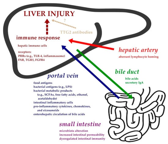 The liver is an organ playing a regulatory role in innate and adaptive immunity. Constituents in portal blood circulating from the intestine to the liver, such as food antigens (including peptides derived from gluten and related cereals), bacterial components and products, can under specific conditions (e.g., impaired intestinal barrier and/or dysregulation of gut–liver axis) trigger the hepatic immune response, which is connected to liver inflammation and fibrosis.