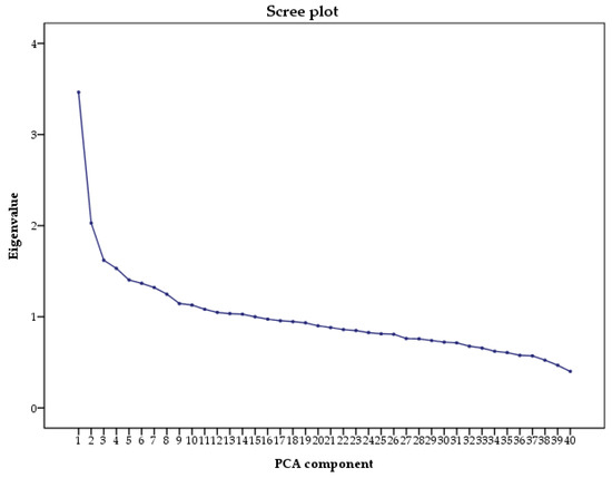 Scree plot of the eigenvalues. We used the scree plot examination to determine the appropriate number of dietary pattern. Scree plot represents the partitioning of the total variation (i.e., eigenvalue) accounted for each principal component, against the principal component number. PCA: principal component analysis.
