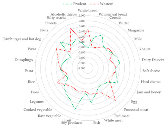 Radar graph of factor loadings characterizing each dietary pattern. Red line indicates factor loadings related to the western dietary pattern. Green line indicates the factor loadings related to the prudent dietary pattern.