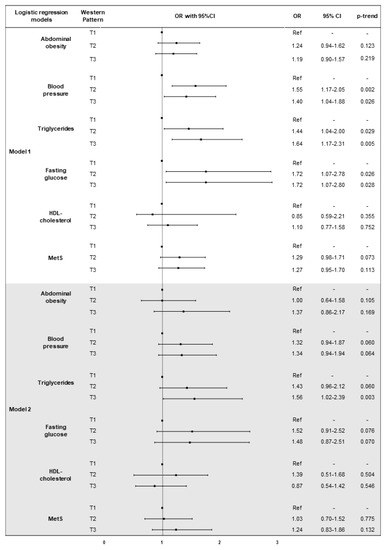 Logistic regression models of the association between western dietary pattern, MetS and it components. Abbreviations: OR, odds ratio; CI, confidence interval; T, tertile; MetS, metabolic syndrome. Model 1: adjusted for age and sex. Model 2: adjusted for age, sex, marital status, employment, educational level, smoking, BMI, total energy intake, and physical activity.