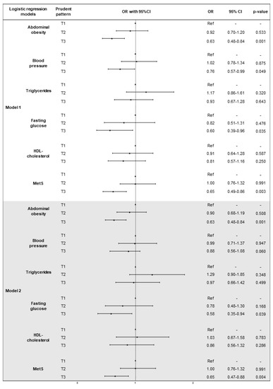 Logistic regression models of the association between prudent dietary pattern, MetS and it components. Abbreviations: OR, odds ratio; CI, confidence interval; T, tertile; MetS, metabolic syndrome. Model 1: adjusted for age and sex. Model 2: adjusted for age, sex, marital status, employment, educational level, smoking, BMI, total energy intake, and physical activity.