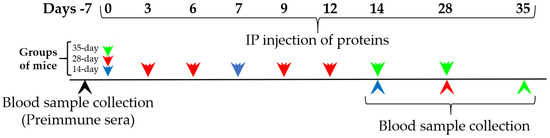 Groups of mice (n = 4–6) were injected with 250 μL of 0.02% OVA (0.05 mg per mouse), 10% PAP (250.0 mg per mouse) or a range of concentrations of CMP (1, 0.2 and 0.1 mg/mL) in PBS. The control groups (n = 6) were ip injected with 250 μL of PBS only (Sigma-Aldrich cat P5368, Saint Louis, Missouri). The immunization treatments with OVA, PAP and CMP were repeated at different time points: days 0 and 7 for 14-day protocol, days 0, 3, 6, 9 and 12 for 28-day protocol, and days 0, 14 and 28 for 35-day protocol. The mice were exsanguinated (from the tail vein) after 14, 28 or 35 days following exposure to the proteins. The three protocols are described in short in Figure 1. Individual serum samples were stored at −80 °C until analysis.