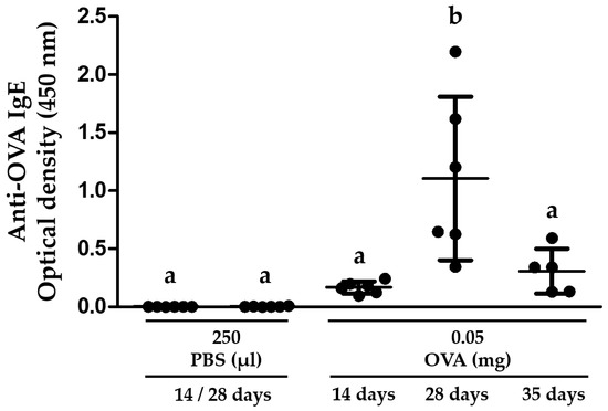 The frequency of ip injections influences the levels of anti-OVA IgE antibodies produced in BALB/c Mice. The animals (n = 5–6 per group) were randomly assigned to a 14-, 28- or 35-day protocol and were injected ip with 250 μL of 0.02% OVA (0.05 mg) for 2, 5, or 3 times respectively (see Figure 1 for details). The mice were exsanguinated after 14, 28 or 35 days according to the protocol used. Different letters mean statistical differences (p < 0.05) by one-way ANOVA and Tukey’s multiple comparison tests. All serum samples were evaluated using ELISA.