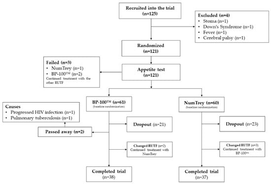 The enrolment schedule of patients based on the randomized product is shown in Figure 1. Screening of patients was carried out between 7 September 2015 and 7 November 2016, and a total of 125 eligible patients were included. Four patients were excluded prior to randomization because of a stoma, Down’s syndrome, fever, or cerebral palsy. In total, 121 were randomized to either BP-100™ (n = 61) or NumTrey (n = 60). Out of 121 patients. Eight patients (four in each group) changed RUTF after randomization and continued treatment. Unfortunately, two patients receiving BP-100™ died during the trial. One patient died due to a progressed HIV infection and the other patient due to pulmonary tuberculosis.