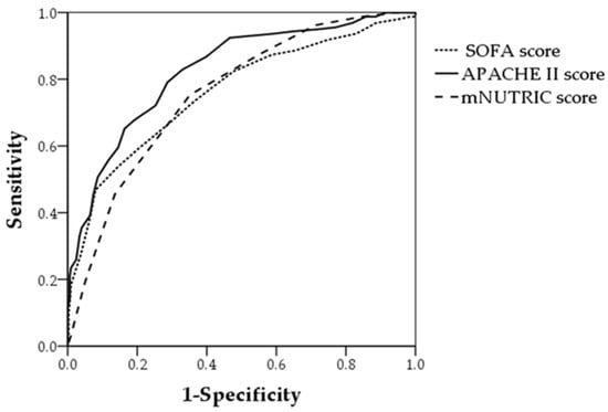 The NUTRIC score is scored from 0 to 10 and the modified NUTRIC score from 0 to 9. When NUTRIC and modified NUTRIC scores were compared, 28-day mortality increased similarly as scores on both assessments increased. The 28-day mortality rate of patients with the maximum NUTRIC score was 66.7% and with the maximum modified NUTRIC score 62.5%. No patients with a score of 0 or 1 on either scale died. Our results are similar to those of other validation studies [,]. The AUC of the original development sample for predicting 28-day mortality was 0.783, which was similar to that of our study []. Upon comparing APACHE II score, SOFA score, and mNUTRIC score, APACHE II score was found to be a better predictor of 28-day mortality. The mNUTRIC score did not have an advantage over APACHE II score in the prediction of prognosis. However, the mNUTRIC score may be not only a predictor of prognosis but also a nutritional risk assessment tool. Unlike NUTRIC score, the mNUTRIC score can be used easily with the exception of IL-6. We found that the best cutoff of the ROC curve for modified NUTRIC score was at 6 (sensitivity 75% and specificity 64%) and the Youden index was 0.391. However, in another study, the best cutoff was at 5 (sensitivity 72% and specificity 63%, respectively) and the Youden index was 0.34 []. The simple method of subtracting 1 from the NUTRIC score to find the modified NUTRIC score may be inaccurate because the IL-6 level is excluded from the modified NUTRIC Score. Further investigation is needed to find the best cutoff score for the high-risk group in the modified NUTRIC Score.