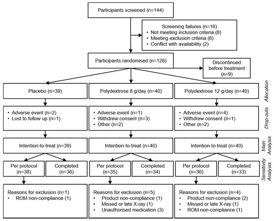 The study was conducted between October 2014 and November 2015. Of the 144 individuals who gave informed consent and were screened, 128 were enrolled and randomized into the three treatment groups (polydextrose 8 and 12 g/day, and placebo). Nine subjects dropped out prior to receiving a test product and were thus excluded from the analysis. Of those, eight withdrew with an explanation (i.e., adverse event (1), incomplete ROM intake (3), conflict with visit schedule (2), personal reason (1), and withdrawal of consent (1)) and one withdrew without an explanation. The remaining 119 who received test products were all included in the intention-to-treat analysis (Figure 2). Of the total randomized, 109 participants (85%) completed the first two weeks of intervention and 103 participants (80%) completed the planned four-week intervention. Baseline demographic and clinical characteristics are provided in Table 1.