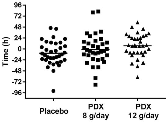 Change in whole gut transit time after two weeks intervention with polydextrose (PDX). Each point represents a study participant (ITT population). Bar indicates the mean.