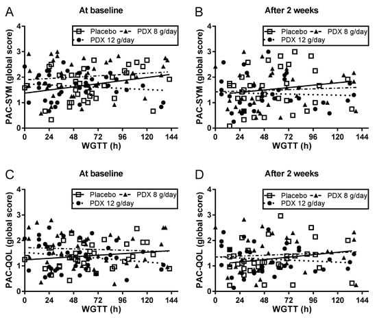 Regression analysis of whole gut intestinal transit time (WGTT) and global scores of PAC-SYM (A,B) and PAC-QOL (C,D) at baseline (A,C) and after two weeks intervention of polydextrose (PDX) (B,D). Individual data points with regression lines are shown.