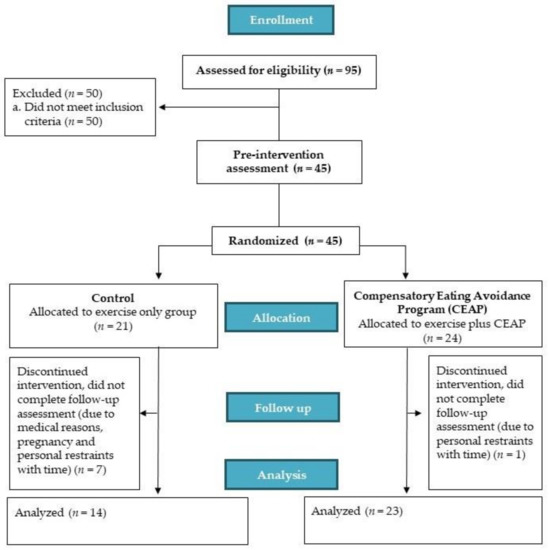A total of 95 individuals expressed interest in the study and were assessed for eligibility between June 2017 and September 2017, with 45 individuals (men n = 15; women n = 30) consenting to participate and being randomized to the exercise only (n = 21) or the exercise plus CEAP (n = 24) (Figure 1). Baseline characteristics of the participants are shown in Table 1. There were no significant differences between the groups (p > 0.05) for mean age, weight, BMI, sex, socio-economic background, exercise behavior, exercise motivation, or cognitive restraint of eating; the groups were well-matched on these variables at baseline. With regard to education status, 92% of the participants reported having at least a bachelor’s university degree.