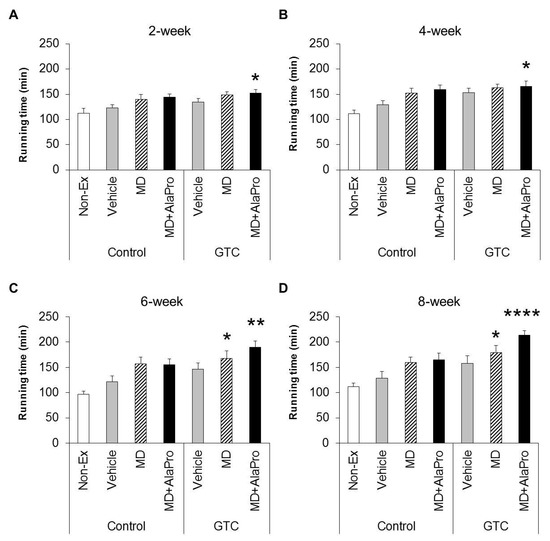 At the 4-week measurement, MD + AlaPro, and not MD alone, in the Control diet group tended to increase running time by 23% (P = 0.097), compared to that by the Vehicle (Figure 1B). In the GTC diet group, Vehicle displayed 18.3% increased endurance performance, which was twice that of the 2-week measurement, indicating that the GTC effect began to appear strongly at week 4; however, the effect was still not significant. GTC + MD tended to increase running time by 25.6% (P = 0.052) and GTC + MD + AlaPro significantly increased running time by 28.3% compared to that of the Control-Vehicle group. At the 6-week measurement, MD and MD + AlaPro in the GTC diet group significantly increased the running time significantly by 38.4% and 55.7%, respectively, compared to the Control-Vehicle group (Figure 1C). After the 6-week measurement, two mice (one each from the Non-Ex and GTC + MD groups) were excluded from the subsequent experiment due to injury. At the 8-week measurement, MD and MD + AlaPro in the Control diet group and Vehicle in the GTC diet group showed a 24.4%, 28.5%, and 22.7% increase in running time, respectively, compared to that in the Vehicle group; however, these differences were not significant. The GTC + MD group displayed a significant 40% increase in running time compared to that by the Control-Vehicle group. In addition, the GTC + MD + AlaPro group showed a significant 66.4% increase, the highest rate of increase in this study, compared to the Control-Vehicle group (Figure 1D).