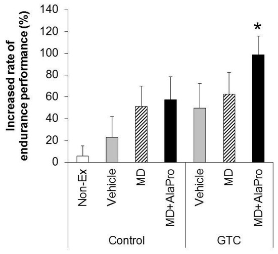 Increased rate of endurance performance after 8-week intervention. Values are means ± SE (n = 8, Non-Ex and GTC + MD: n = 7). * P < 0.05 vs. Control-Vehicle group (Dunnett’s test).