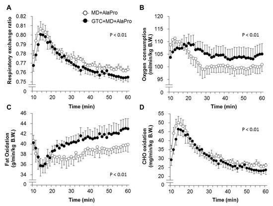 To elucidate the combinational effect of continuous GTC intake and pre-exercise MD + AlaPro on energy metabolism during running exercise, we performed indirect calorimetry analysis in both control and GTC diet fed groups supplemented with pre-exercise MD + AlaPro administration in Experiment 2. Two-way repeated measures ANOVA indicated significant differences in groups and time for RER, oxygen consumption, fat oxidation, and CHO oxidation during the 50-min running at a speed of 20 m/min, with no significant interaction between these parameters. GTC + MD + AlaPro showed lower RER (Figure 3A) and higher oxygen consumption (Figure 3B) than the results using MD + AlaPro alone. GTC + MD + AlaPro showed higher fat oxidation (Figure 3C) and lower CHO oxidation (Figure 3D) than those of MD + AlaPro alone.