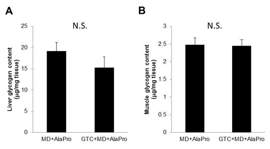 Glycogen storage in (A) liver and (B) gastrocnemius muscle after running exercise. Both control and GTC group mice were fed MD + AlaPro 60 mins before running and ran on the treadmill for 60 mins at 20 m/min. Subsequently, the liver and muscles were collected. Values are means ± SE (n = 8). N.S., not significant.