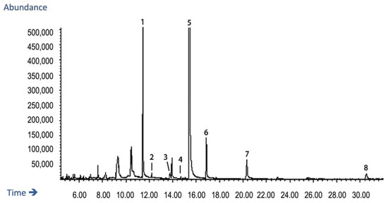 GC-MS total ion current (TIC) chromatogram of the Lupinus mutabilis (LM) extract. From the MS spectra, the fragmentation patterns of the eluting peaks were compared against the Wiley 275 mass spectral library, and the following compounds were tentatively assigned: Peak 1 Sparteine MW 234; peak 2 Palmitic acid MW 256; peak 3 Linoleic acid and Oleic acid MW 280 and 282 respectively; peak 4 and 5 Lupanine/α-Lupanine MW 248; peak 6 Nuttalline MW 264; peak 7 Oxylupanine MW 264, and peak 8 11,12-Dehydrolupanine MW 246.