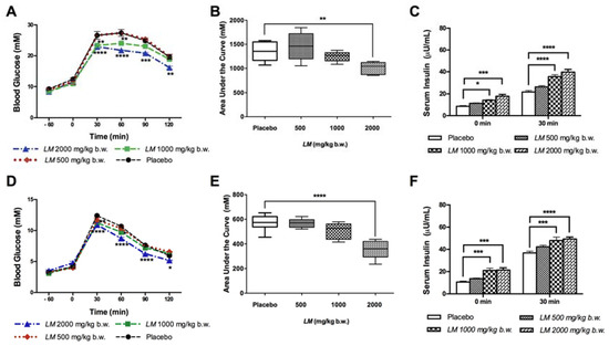 A similar effect was found in W rats, where LM (2000 mg/kg b.w.) improved glucose tolerance during the OGTT starting at 30 min with a lower effect of LM (1000 mg/kg b.w.) but not of 500 mg/kg b.w. (Figure 3D). The AUC of glucose of LM (2000 mg/kg b.w.) treatment was reduced to 353.8 ± 31.3 mM/120 min, versus placebo W rats (572.0 ± 27.6 mM/120 min) (Figure 3E). Serum insulin levels in W rats were also higher, 60 min after LM administration (1000 and 2000 mg/kg b.w.) and 30 min after glucose challenge (1000 mg/kg b.w. and 2000 mg/kg) (Figure 3F).