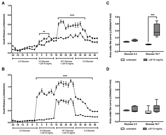 The effect on insulin secretion was monitored in islets perifused with LM (10 mg/mL). Significant differences in insulin release were observed when GK rat islets were perifused during the period of 0–10 min with LM in low glucose (3.3 mM) and during the period of 18–30 min, when islets were perifused with LM in high glucose (16.7 mM) compared to untreated perifused islets during the respective time points (Figure 5A). Interestingly, the effect on insulin release continued after of LM removal, being statistical significant up to 42 min. A similar pattern was found in W rat islets perifused with LM during the periods of 0–14 min (3.3 mM) and 18–30 min (16.7 mM) (Figure 5B).