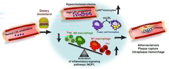 Hypercholesterolemia (especially high LDL-C) promotes CVD progression. However, the impact of dietary cholesterol on this disease is highly dependent on the ability to dietary cholesterol to modulate plasmatic cholesterol levels [84]. Although dietary cholesterol studies in animal models may not directly translate to humans, they have been useful to better understand the mechanisms of the process. Thus, as pointed out above, manipulation of dietary components has been employed to induce atherosclerosis in LDLr-/- mice, to speed up atheroma plaque formation animal models, to “humanize” lipoprotein profiles, to stress hepatic cholesterol metabolism for wide metabolomic screenings, and to induce coronary artery atherosclerosis and vulnerable plaques. Figure 2 displays the main determinants by which cholesterol in the diet accelerates atheroma plaque formations. Dietary cholesterol produces hypercholesterolemia and may increase circulating levels of pro-inflammatory Ly6Chi monocytes. This environment facilitates foam cell formation by uptake of modified LDL particles by CD36 scavenger receptors, among others. Deranged balance between pro-inflammatory Th1 and Treg cells and polarization of macrophages toward a pro-inflammatory M1 phenotype also lead to secretion of inflammatory mediators inducing the formation of advanced plaques, which are vulnerable to rupture, hemorrhage and thrombus formation.