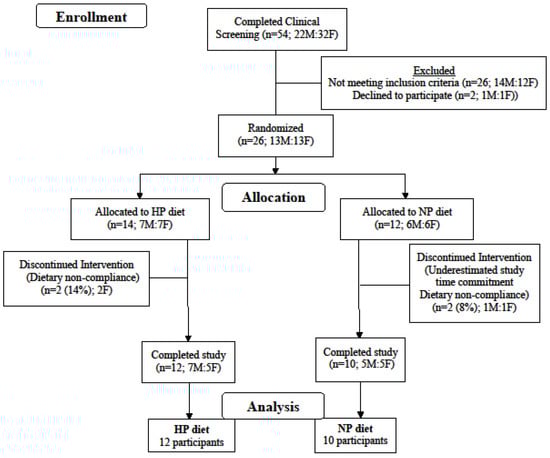 Consolidated Standards of Reporting Trials flow diagram. Flow of participants and study analysis. Females, F; High protein, HP; Males, M; Normal protein, NP.