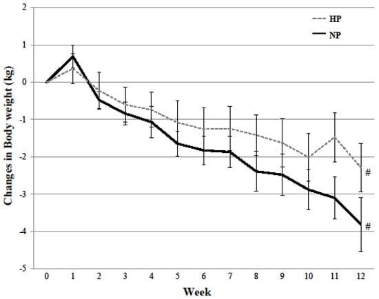 Changes in body weight over 12-week dietary intervention between the high protein and normal protein diet. Mean ± SD; Repeated measures ANCOVA controlling for sex: Time Effect (# p values < 0.05). High protein, HP; Normal protein, NP.