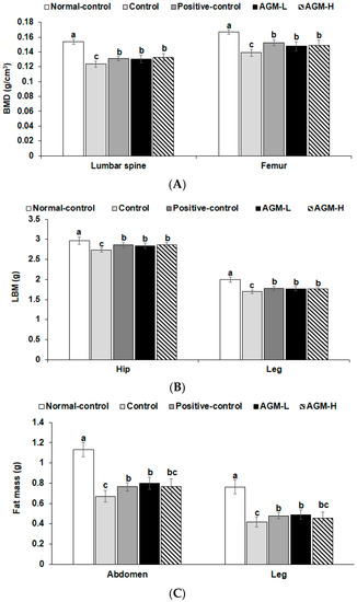 BMD in the lumbar spine and femur was much lower in the control group than the normal-control group whereas AGM-L and AGM-H prevented the decrease of BMD as much as the positive-control group (p < 0.05; Figure 1A). LBM showed a similar pattern of BMD. LBM exhibited a lower value in the control group than the normal-control and AGM-L and AGM-H protected against the decrease of LBM as much as the positive-control group (p < 0.05; Figure 1B). Fat mass also showed the similar tendency to LBM (Figure 1C).