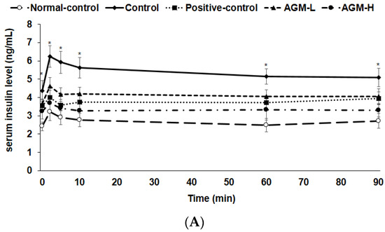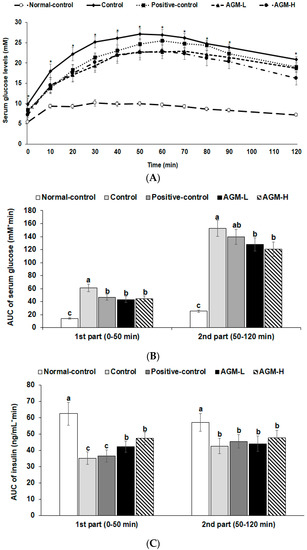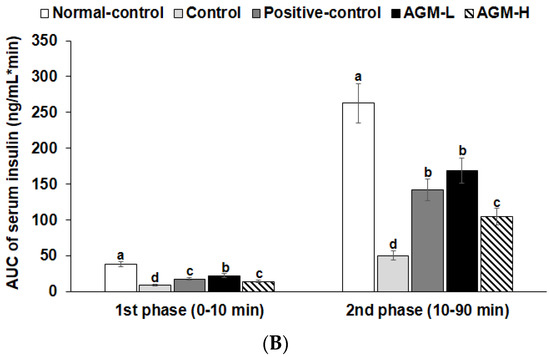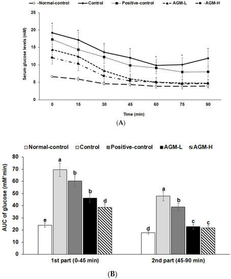At 6 h after food deprivation, serum glucose levels were much higher in the control group than the normal-control group and the levels were lowered in the descending order of the control, positive-control, AGM-L and AGM-H (p < 0.05; Figure 3A). After insulin injection, serum glucose levels decreased until 60 min in all groups and the levels were almost maintained in all groups except the control group. The AUC of serum glucose concentrations were much higher in the control than in the normal-control in the 1st and 2nd phase (Figure 3B). AGM-L and AGM-H markedly decreased serum glucose levels during the 1st phase and the levels at the 2nd phase was similar to the normal-control group (p < 0.05; Figure 3B). Thus, AGM-L and AGM-H improved insulin tolerance in comparison to the control.