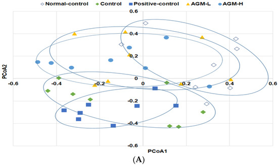 Community composition of the gut microbiota was compared with both total and shared operational taxonomic units among the groups by analysis of molecular variance (AMOVA). The AMOVA test revealed significant differences between the fecal bacterial communities among the groups (p < 0.01). Principal coordinate analysis (PCoA) illustrates the clustering of gut bacterial community (Figure 5A). Normal-control and control showed a significant separation of gut microbiota. AGM-L and AGM-H also had separate gut microbiota clustering from control but they overlapped with the normal-control. However, positive-control exhibited a similar pattern to that of the control group (Figure 5A). These results indicated that diabetes modulated the composition of gut microbiome and AGM prevented the modulation of gut microbiome.