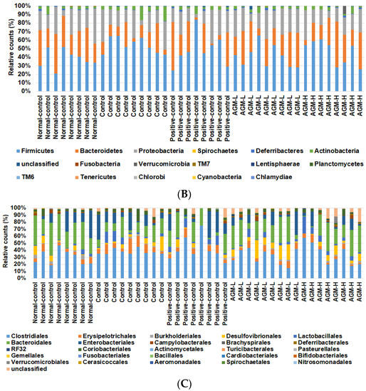 The bacterial distribution was different among the groups at the phylum and order levels (Figure 5B,C). The major bacteria were Firmicutes, Bacteriodetes, Proteobacteria, Actinobacteria, and Deferribacteres at the phylum level. The percentage of Firmicutes was higher in the control group than the normal-control group and AGM-L and AGM-H reduced its percentage (Figure 5B). In contrast to Firmicutes, the percentage of Bacteroidetes was lower in the control than the normal-control and it increased with AGM-L and AGM-H (p < 0.05; Figure 5B). The percentages of Proteobacteria, Actinobacteria, and Deferribacteres were not altered by diabetic status and AGM supplementation (Figure 5B). The bacteria community was different among the groups in order level more than the phylum level. The percentage of Bacteroidales was much lower in the control than the normal-control and it was increased by AGM-L and AGM-H (Figure 5C). The percentages of Erysipelotrichales and Clostridiales were higher in the control than the normal-control and they were decreased by AGM-L and AGM-H. AGM-L increased the percentage of Desulfovibrionales (p < 0.05; Figure 5C). Thus, AGM-L modulated gut microbiome to make it similar to the normal-control.