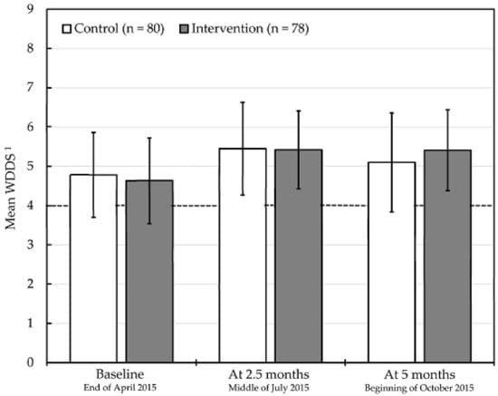 Although the mean WDDS among the intervention group increased from 4.6 (SD = 1.1) at baseline to 5.4 (SD = 1.0) at both follow-ups, no significant differences in WDDS between groups could be observed, which is assumed to be in line with the lunch provisions’ overall little impact on 24-h food group intake. The mean WDDS in control subjects was 5.4 (SD = 1.2) and 5.1 (SD = 1.3) at 2.5 and 5 months, respectively.