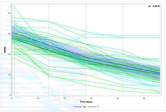 Effect of magnesium or placebo supplementation on Hamilton Depression Rating Scale (HDRS) scores in patients treated with fluoxetine.