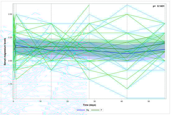The following therapeutic ranges were adopted [42,43]: fluoxetine 50–450 ng/mL, norfluoxetine 50–350 ng/mL, fluoxetine and norfluoxetine 50–550 ng/mL. Serum fluoxetine levels were measured at the Psychopharmacology Laboratory of the Department of Psychiatry, WUM. Serum magnesium levels were measured by ALAB Laboratories and analyzed with the use of Hulanicki’s method [44]. The established ALAB reference range for serum magnesium levels (1.7–2.5 mg/dL) was adopted for this study. This was a double-blind study—with the principal investigator blinded to the magnesium levels in individual participants before study completion, as the laboratory reported only abnormalities in magnesium levels.