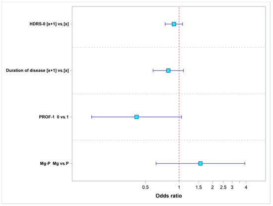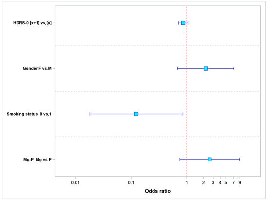 Model 2 (Table 3)—which was used to analyze treatment efficacy, included the following parameters: the baseline HDRS score; the patients’ gender; smoking status; and the type of treatment (magnesium vs. placebo). Figure 4 shows the increase in the baseline HDRS score by 1 point and being a non-smoker (p = 0.0034) reduced the odds of effective treatment. The female sex and the use of magnesium to potentialize the effect of fluoxetine increased the odds of effective treatment.