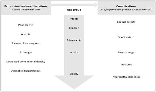 A gluten-free diet has also been shown to be beneficial for more advanced extraintestinal manifestations, such as a low bone mineral density, liver failure, and infertility [,,,,,], but here, the timing of the diagnosis is crucial (Table 2). Early developing complications such as dental enamel defects should actually be treated even before their appearance []. In children with poor growth, a significant catch-up growth is usually achieved after the beginning of dietary treatment and thus reduced adult height is uncommon [,]. However, growth problems should likely be treated at latest in puberty, in order to avoid suboptimal height development [,,]. With regards to bone health, patients diagnosed in childhood seem to have no increased risk for osteoporotic fractures [], but again, in order to achieve optimal bone accrual, an early diagnosis is beneficial [].