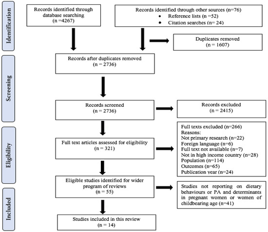 The search strategy identified a total of 4343 citations (Figure 1). Exclusion of duplicates, initial screening of titles and abstracts and screening of full-texts against inclusion criteria left 55 potentially eligible studies. A further 41 studies were excluded from this review as they did not address dietary and PA behaviours in pregnant women or women of childbearing age and only reported data on weight status of women and children. These studies will inform additional systematic reviews relating to the wider research programme. Fourteen studies were included in this review.