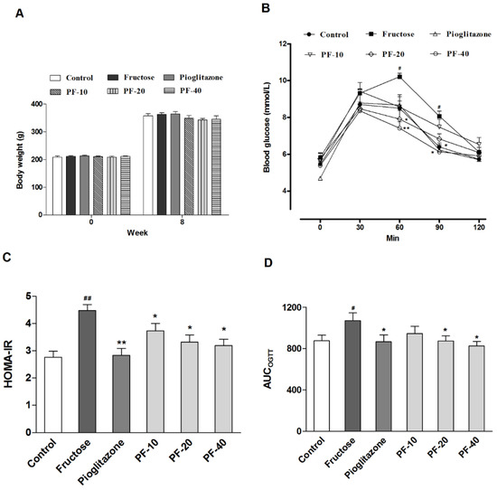 Figure 2. Effects of paeoniflorin on the body weight and insulin sensitivity in rats. Data are expressed as the mean ± SEM (n = 8). (A) Body weight. (B) The oral glucose tolerance test. (C) The homeostasis model assessment insulin resistance index (HOMA-IR) index. (D) The area under curve during oral glucose tolerance test (OGTT). Data was analyzed by one-way ANOVA followed by Dunnett’s post hoc test. # p < 0.05 and ## p < 0.01 vs. control group. * p < 0.05 and ** p < 0.01 vs. fructose group. PF-10: 10 mg/kg of paeoniflorin; PF-20: 20 mg/kg of paeoniflorin; PF-40: 40 mg/kg of paeoniflorin. HOMA-IR: Homeostasis model assessment insulin resistance index; OGTT: Oral glucose tolerance test; AUC: Area under curve.