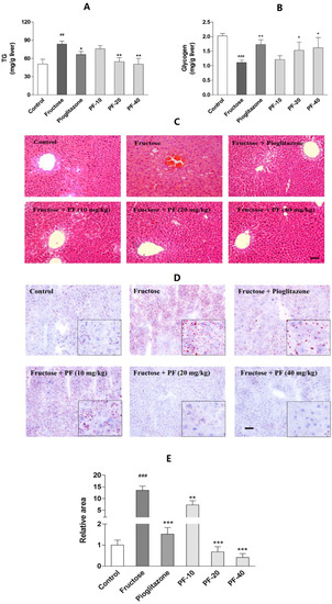 Figure 3. Effects of paeoniflorin on the hepatic lipids and glycogen contents. (A) Hepatic lipids contents. (B) Hepatic glycogen contents. (C) HE staining (200 ×). (D) Oil-red O staining (200 ×). Insets from the images are magnified five times in order to highlight the lipid-staining morphology. (E) Relative area of Oil-red O staining. Data were expressed as the mean ± SEM. (n = 8). Data was analyzed by one-way ANOVA followed by Dunnett’s post hoc test. ## p < 0.01 and ### p < 0.001 vs. control group. * p < 0.05, ** p < 0.01 and *** p < 0.001 vs. fructose group. PF-10: 10 mg/kg of paeoniflorin; PF-20: 20 mg/kg of paeoniflorin; PF-40: 40 mg/kg of paeoniflorin. The scale bar represents a length of 50 μm.