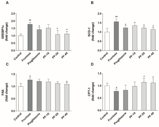 Figure 4. Effects of paeoniflorin on the mRNA expression of SREBP1c, SCD-1, FAS and CPT-1 in liver. (A) The mRNA expression of SREBP1c. (B) The mRNA expression of SCD-1. (C) The mRNA expression of FAS. (D) The mRNA expression of CPT-1. Data were normalized by the abundance of GAPDH and expressed as the relative value to control. Data were expressed as the mean ± S.E.M. (n = 6) and analyzed by one-way ANOVA followed by Dunnett’s post hoc test. # p < 0.05 and ## p < 0.01 vs. control group. * p < 0.05 vs. fructose group. PF-10: 10 mg/kg of paeoniflorin; PF-20: 20 mg/kg of paeoniflorin; PF-40: 40 mg/kg of paeoniflorin. SREBP1c: Sterol regulatory element-binding protein 1c; SCD-1: Stearyl coenzyme A decarboxylase; FAS: Fatty acid synthetase; CPT-1: Carnitine palmitoyltransferase I.