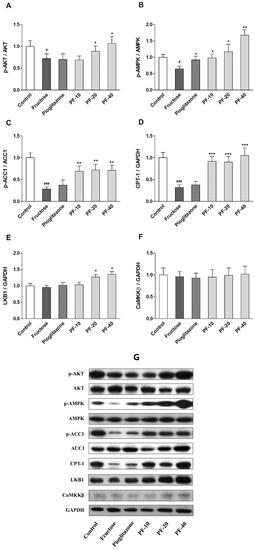 Figure 5. Effects of paeoniflorin on the body weight and insulin sensitivity in rats. (A) The phosphorylation level of AKT. (B) The phosphorylation level of AMP-activated protein kinase (AMPK). (C) The phosphorylation level of ACC1. (D) The protein expression of CPT-1. (E) The protein expression of LKB1. (F) The protein expression of CaMKKβ. (G) Immunoblot bands. Data were normalized by the abundance of GAPDH and expressed as the relative value to control. Data were expressed as the mean ± SEM (n = 6) and analyzed by one-way ANOVA followed by Dunnett’s post hoc test. # p < 0.05 and ### p < 0.001 vs. control group. * p < 0.05, ** p < 0.01 and *** p < 0.001 vs. fructose group. PF-10: 10 mg/kg of paeoniflorin; PF-20: 20 mg/kg of paeoniflorin; PF-40: 40 mg/kg of paeoniflorin; AKT: Protein kinase B; AMPK: AMP-activated protein kinase; ACC1: Acetyl coenzyme A carboxylase; CPT-1: Carnitine palmitoyltransferase I; GAPDH: Glyceraldehyde-3-phosphate dehydrogenase; LKB1: Tumor suppressor serine/threonine kinase 1; CaMKKβ: Ca2+/CaM-dependent protein kinase kinase β.