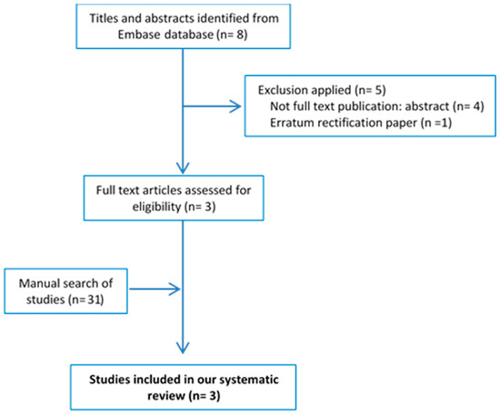 The EMBASE search strategy (‘osteoarthritis’/exp/mj OR ‘osteoarthritis’/mj) AND (‘Mediterranean diet’/exp/mj OR ‘Mediterranean diet’/mj) yielded a total of eight articles. After applying the selection criteria, three publications were selected. The flowchart showing the procedures for selecting the studies is shown in Figure 1. Table 1 shows the main characteristics of the selected articles and Table S2 shows a summary of their main findings [37,38,39]. Two articles reported cross-sectional data from the same study, namely the Osteoarthritis Initiative conducted in the USA [38,39], while the third was a randomized controlled trial [37]. The risk of bias was fair in both cross-sectional studies and unclear in the randomized controlled trial.