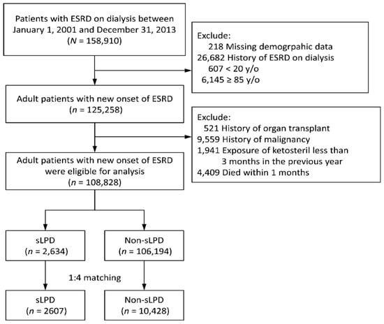 To verify the relationship between an sLPD and long-term survival effect in permanent dialysis patients, we designed a population-based, nationwide, retrospective study. As shown in Figure 1, patients aged between 20 and 85 years with new-onset ESRD and who needed renal replacement therapy between 2001 and 2013 were identified from the RCIPD.
