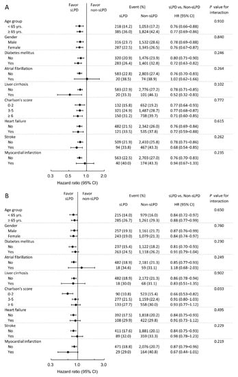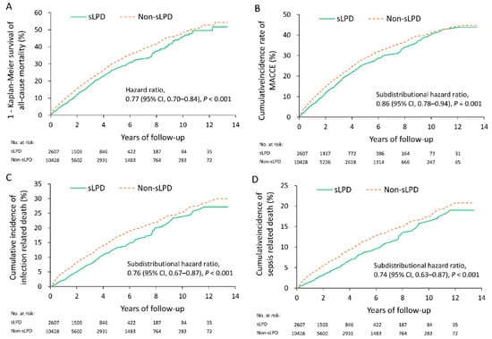 After matching, 2607 patients remained in the sLPD group and 10,428 remained in the non-sLPD group. With a mean follow-up of 3.1 years (standard deviation 2.7 years), the sLPD group exhibited a lower rate of all-cause mortality compared with the non-sLPD group (23.1% vs. 27.6%, hazard ratio (HR) 0.77, 95% confidence interval (CI) 0.70–0.84). Regarding MACCEs, the sLPD group had a lower risk compared with the non-sLPD group (19.2% vs. 21.5%, HR 0.86, 95% CI 0.78–0.94). The Kaplan–Meier survival curves for all-cause mortality are presented in Figure 2A and the cumulative incidence rates of MACCEs are depicted in Figure 2B.